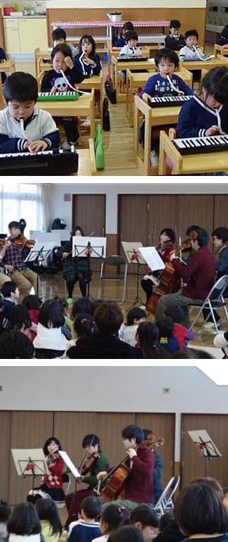 若かりし頃、部員としてホルンを吹いていた理事長の母校である東京歯科大学学生オーケストラによる生演奏や山内楽器と菊岡田鶴子先生によるヤマハのミニコンサート等、見たことのない様々な楽器から奏でられる実際の音を体感し、音楽の楽しさや美しさ、音のおもしろさに触れられるよう、できる限り本物の楽器や音を幼い耳に伝えていきます。